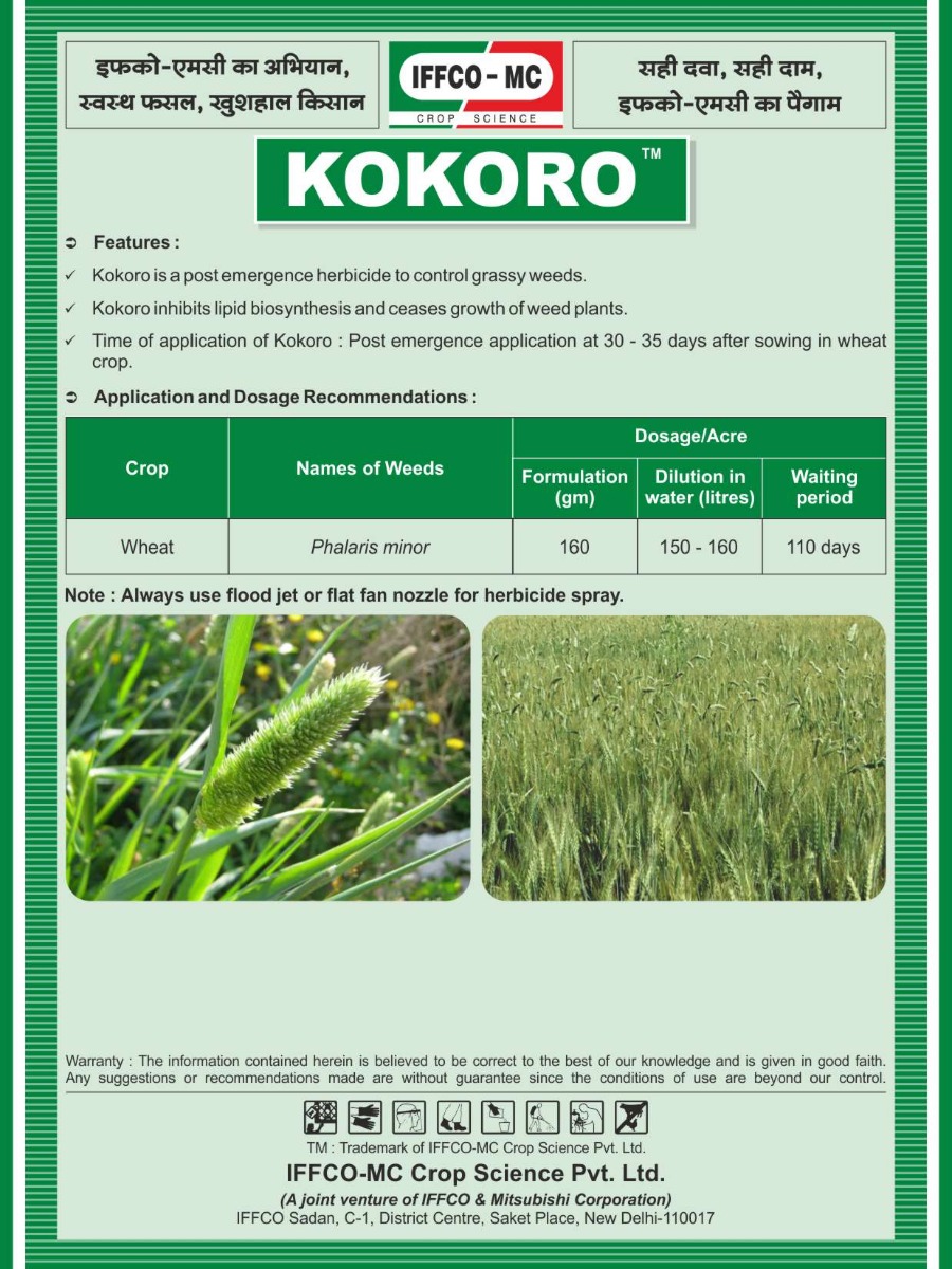 2. KOKORO is recommended on Wheat crop as a post emergent for the control of Phalaris minor.